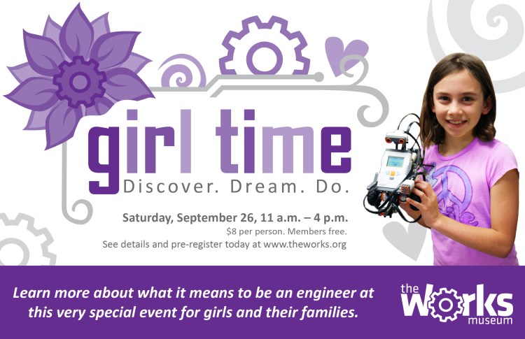 At the Works Museum, I redesigned all exhibits and museum signage. This included working with large format printers, installers, and hand-painting gears. The camp area was transformed with large classroom numbers, fun graphics, and ADA compliance. I also created the logo and brand for the Women in Stem event – Girl Time. This event grew tremendously after my branding was implemented.